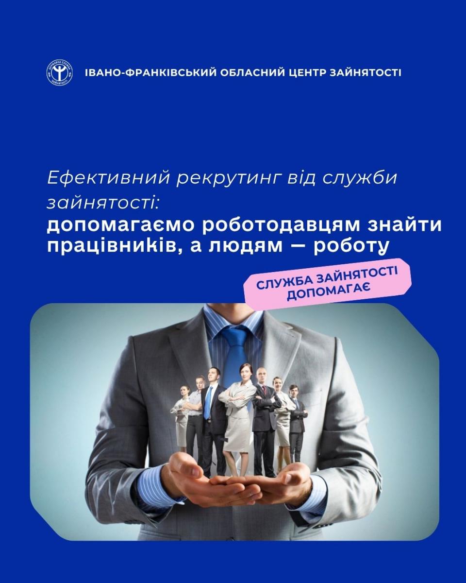 Рекрутинг від служби зайнятості — це комплекс безкоштовних послуг, спрямованих на ефективне укомплектування вакансій та підбір кандидатів відповідно до потреб роботодавців.