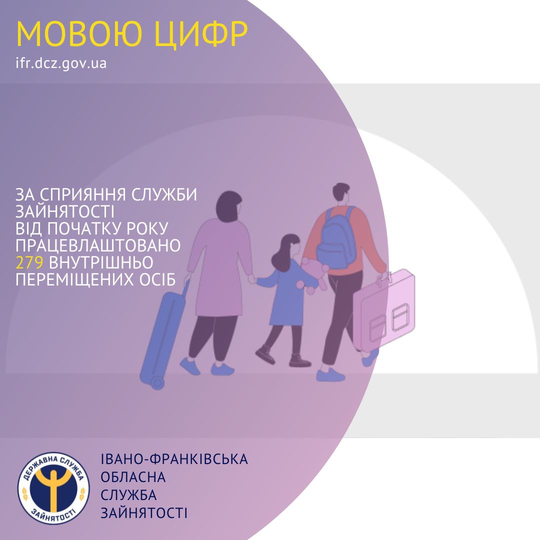 В січні-квітні 2024 року статус безробітного мали 1238 внутрішньо переміщених осіб. За сприяння служби зайнятості 279 внутрішньо переміщених осіб були працевлаштовані.