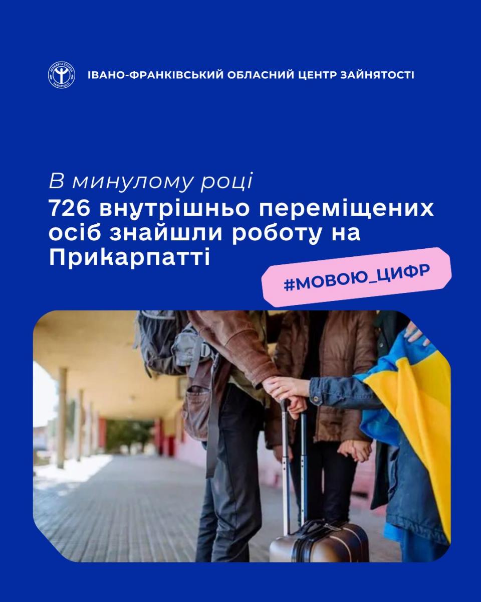 В минулому році статус безробітного мали 1601 внутрішньо переміщена особа. За сприяння служби зайнятості 726 внутрішньо переміщених осіб були працевлаштовані.