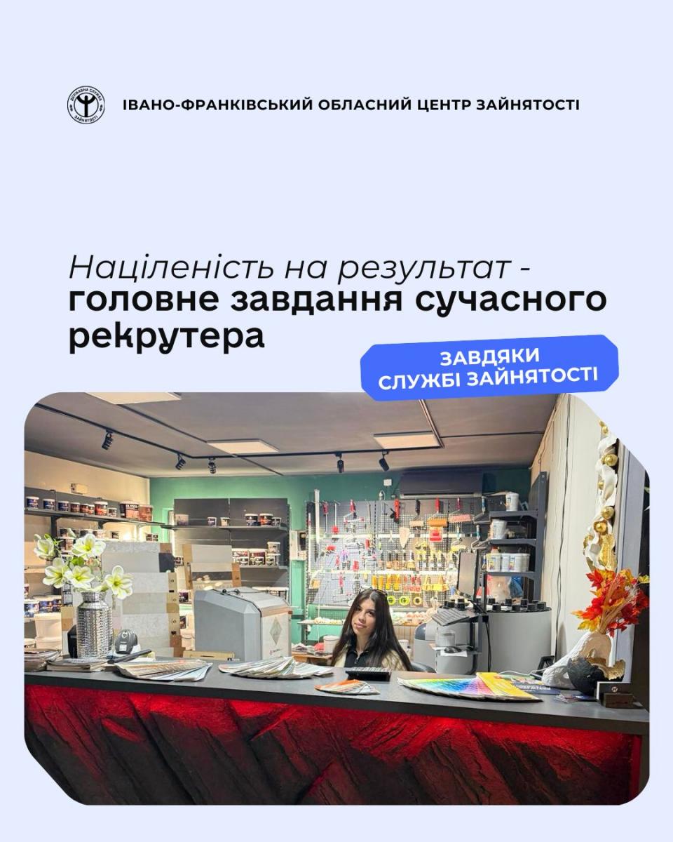 Прикладом успішного працевлаштування на засадах рекрутингу є історія Аліни Кравчук, яка за сприяння Івано-Франківської філії Івано-Франківського обласного центру зайнятості була працевлаштована на посаду продавця-консультанта.