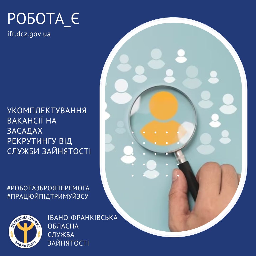 Косівська філія Івано-Франківського обласного центру зайнятості з метою надання допомоги в пошуку персоналу та роботи методом рекрутингу намагається вчасно і якісно сприяти в укомплектуванні вакансій як юридичним, так і фізичним особам-підприємцям, а також знайти омріяну професію шукачам роботи.