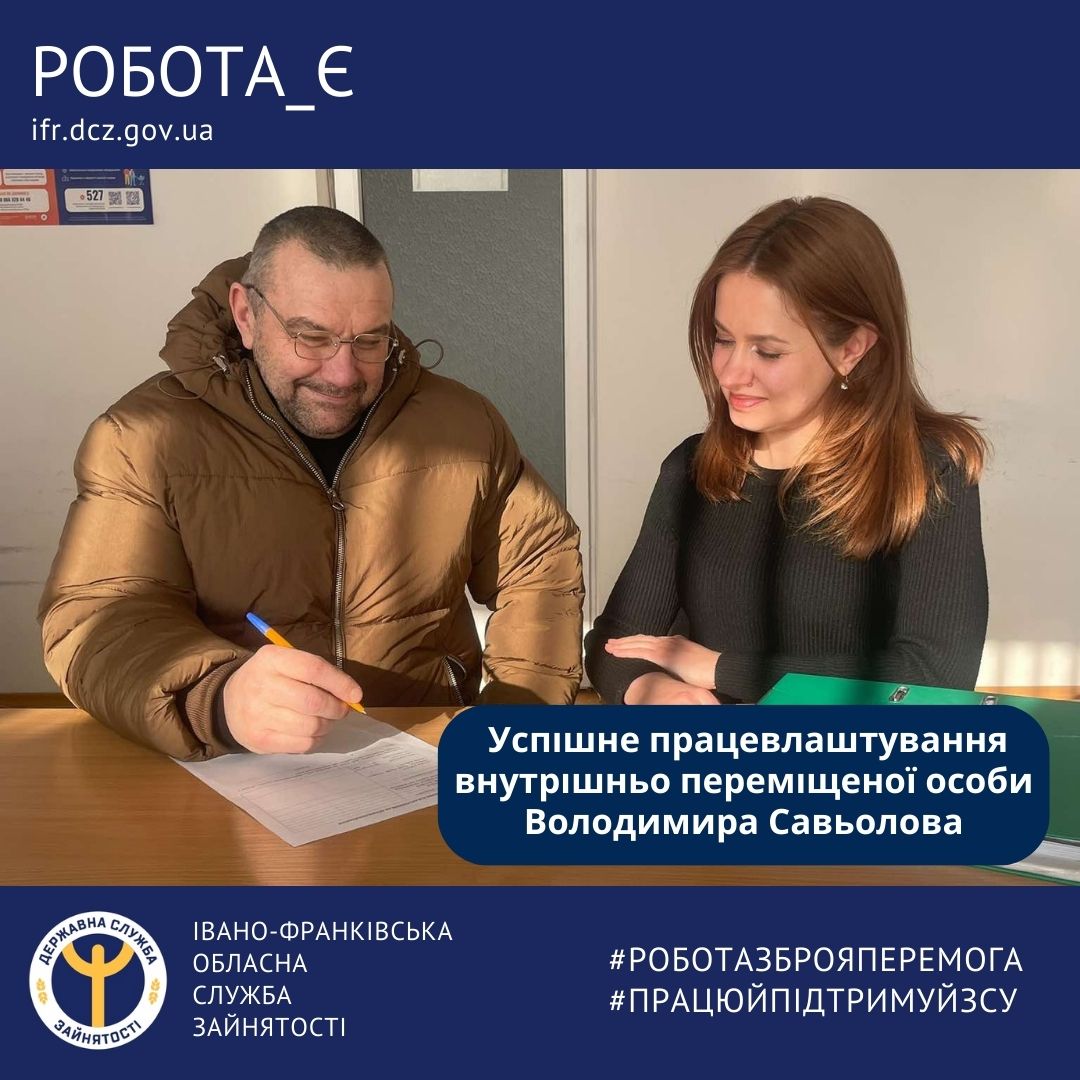 З метою пошуку роботи до Яремчанського управління Надвірнянської філії Івано-Франківського обласного центру зайнятості звернувся Володимир Савьолов, який є внутрішньо переміщеною особою.