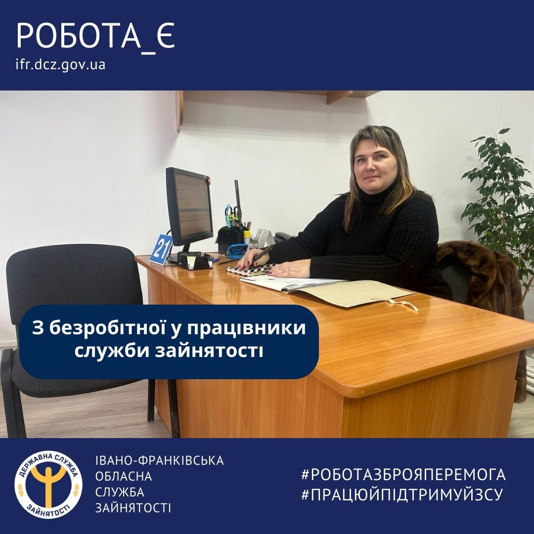 Як результат, з початку цього року пані Оксана приєдналася до дружньої команди працівників служби зайнятості і на даний час працює на посаді консультанта роботодавця в Косівській філії Івано-Франківського обласного центру зайнятості.