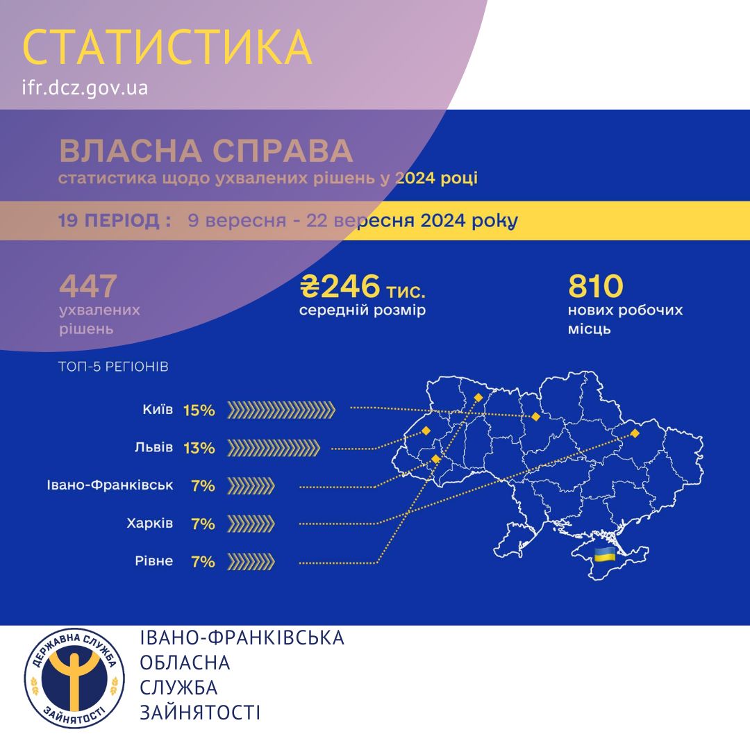 Оголошено переможців дев’ятнадцятого періоду подачі заяв на отримання мікрогрантів згідно з програмою «Власна справа», який тривав з 09 вересня до 22 вересня 2024 року, Івано-Франківська область увійшла у трійку лідерів серед регіонів з найбільшою кількістю прийнятих Державним центром зайнятості позитивних рішень.