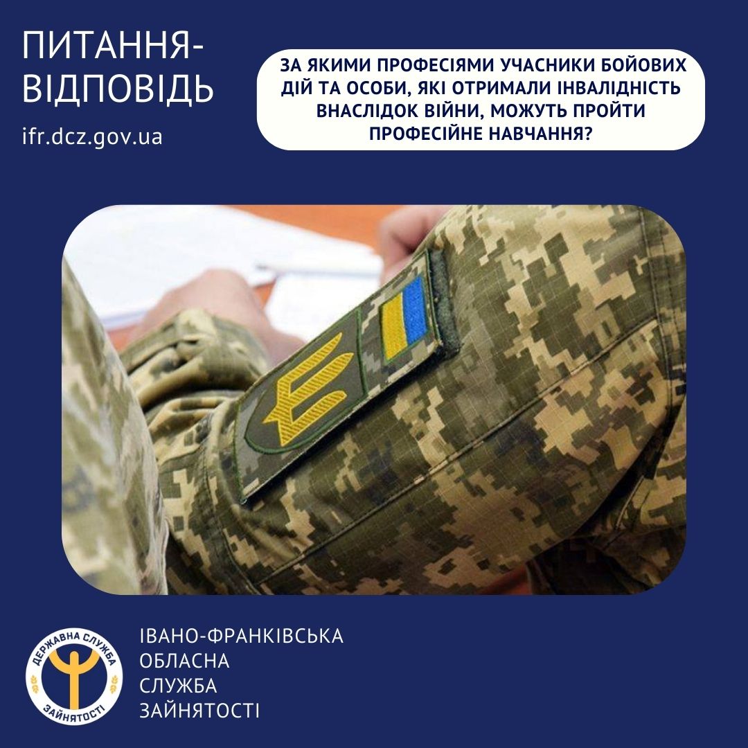 З інформацією щодо навчання учасників бойових дій та осіб з інвалідністю внаслідок війни можна ознайомитися на вебсторінці Державного центру зайнятості https://is.gd/nAezlC.
