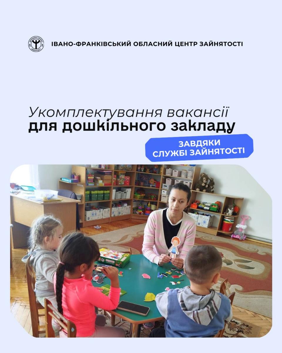До Долинського управління Калуської філії Івано-Франківського обласного центру зайнятості за допомогою у підборі працівника на посаду асистента вихователя звернулася завідувачка ЗДО «Зернятко».
