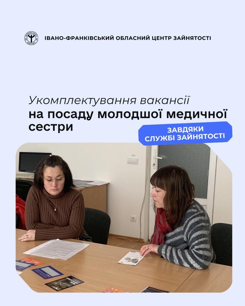 Враховуючи освіту та досвід роботи безробітної, їй було запропоновано вакансію на посаду молодшої медичної сестри до КНП «Яремчанська центральна міська лікарня».